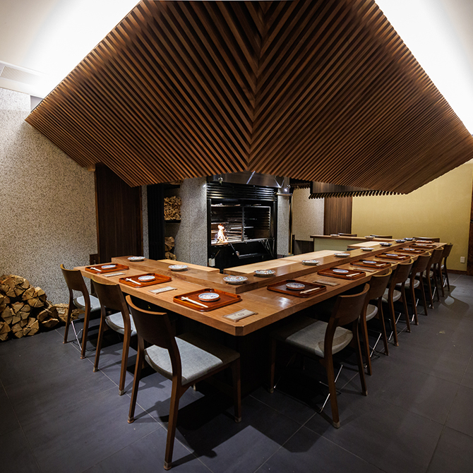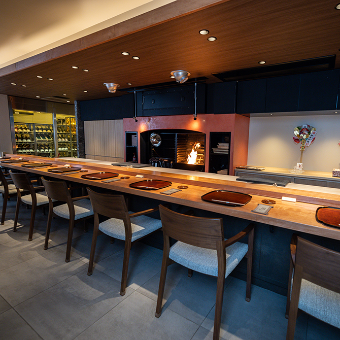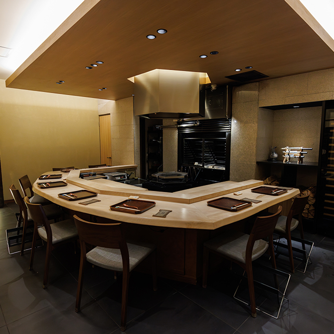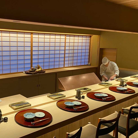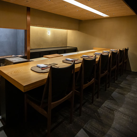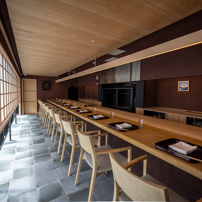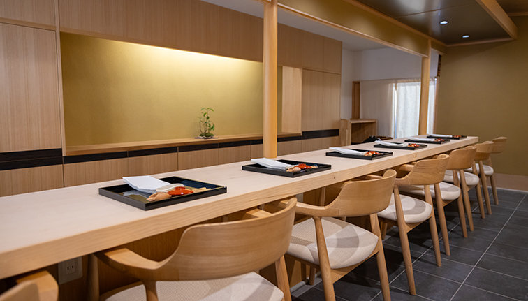 『銀座しのはら』の篠原氏の片腕として、滋賀の時代から共にした澤田氏が、満を持して大阪にオープン。茶室をイメージしたデザインの6席のひのきの一枚板のカウンターで、古典を大事にし、新しいことにチャレンジする料理を提供。