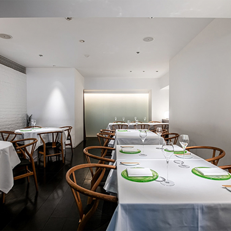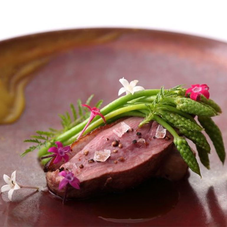 銀座・レンガ通りのビルの地下1階にあるフレンチレストラン。『ル スプートニク』などで研鑽を積んだ五代目シェフ・早田六月氏が、正統フレンチを守りながら、独自の世界観で新たなコースを展開する。スペシャリテの「ヤマメのマトロート」は、シェフの故郷・福島の原風景から発想した一皿。トマトをたくさん楽しめる皿をテーマに考案した「トマト ホヤ」は、生のホヤとトマトの組み合わせが新鮮だ。店内には白を基調とした落ち着いたメインダイニングと、優美なデザインの個室が用意されており、非日常な空間を演出。記念日デートや素敵な大人の会食などで、ぜひ訪れていただきたい。
