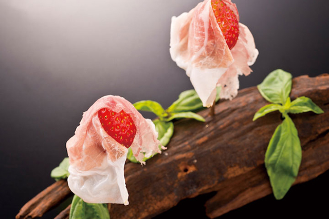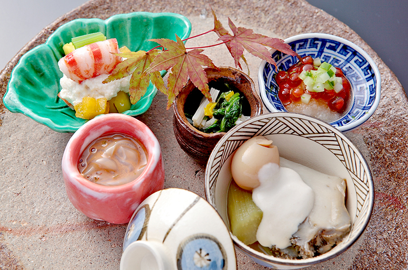 Italian-inspired cuisine with 15 small courses, displayed on traditional Japanese dishware